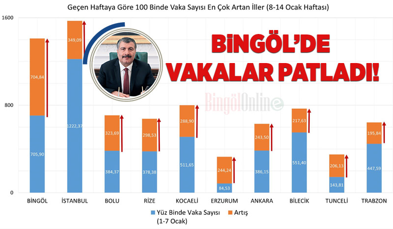Sağlık Bakanı Fahrettin Koca'nın 8-14 Ocak 2022 tarihlerini kapsayan döneme dair 100 binde vaka sayısı en çok artan 10 ili açıkladı. Bakan Koca'nın paylaştığı verilerde, 100 binde 704,84 artış hızı ile birinci sırada yer alan Bingöl, vaka yoğunluğu açısında da haftalık 1410 vaka ile üçüncü sırada yer aldı. Bir önceki aya oranla yüzde 70'lik bir artış söz konusu. Açıklanan verilere göre 283 Bin nüfuslu Bingöl'de haftalık 3 Bin 964 vaka görülürken, vaka hızının düşürülmesi için maske, mesafe ve aşı çağrıları de devam ediyor.