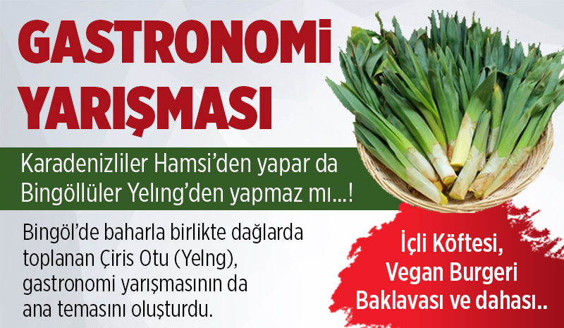 | Bingöl'de Yelıng Lezzetleri YarıştıTurizm Haftası kapsamında Bingöl Üniversitesi tarafından düzenlenen ve Çiris Otuyla (Yelıng) yapılmış yiyeceklerin yarıştığı organizasyonda kursiyerler hünerlerini sergiledi. Yelng'den neler yapılabildiği de bu sayede görülmüş oldu. Bingöl'de baharla birlikte dağlarda toplanan Çiris Otu (Yelng), gastronomi yarışmasının da ana temasını oluşturdu. Turizm Haftası (17-22 Nisan) münasebetiyle Bingöl Üniversitesi tarafından düzenlenen yarışma ve etkinlikte, Bingöl'ün gastronomik değerlerini tanıtmak ve yerel mutfak kültürünü yaşatmak için Çiris Otu (Gulık/Yelıng) Konseptli Yemek Yarışması düzenlendi. Çok sayıda kurum, kuruluş ve merkeziden temsilcilerin yarıştığı ve il dışından gelen jüri üyelerinin puanlama yaptığı yarışmaya 4 kategoride (Çorba, Ana yemek, Hamur işi ve Tatlı) 32 kursiyerle katılım sağlayan Bingöl Halk Eğitim Merkezi, dört kategoride de birincilik elde etti. Yelıng'den sayısız çeşityemek yapıldığının gösterildiği ve lezzet bakımından da büyük beğeninin toplandığı yarışmada dereceye girenlere çeşitli hediyeler ve Batum Gezi turu hediye edildi. Yarışma sonucuna ilişkin bir mesaj paylaşan Bingöl İl Milli Eğitim Müdürlüğü, dereceye giren kursiyerlerini tebrik etti. Milli Eğitim Müdürlüğü açıklamasında;