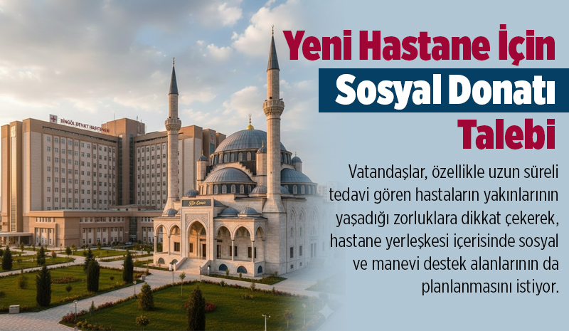 Bingöl'de yapımı süren yeni devlet hastanesinin, yalnızca sağlık hizmeti sunan bir yapı olmasının ötesinde; hasta ve hasta yakınlarını merkeze alan cami, refakatçi evi, kütüphane ve sosyal ikram alanlarını içeren sosyal donatılarla birlikte planlanması talep ediliyor.