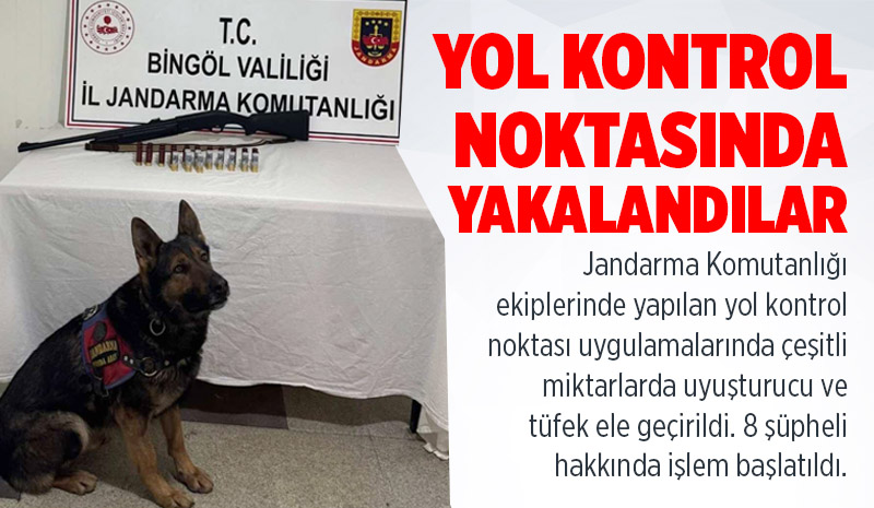 “Bingöl İl Jandarma Komutanlığı unsurlarınca uyuşturucu veya uyarıcı madde imal ve ticaretinin önlenmesi ve aranan şahısların yakalanmasına yönelik yapılan istihbarı çalışmalar neticesinde, İl Merkez, Genç ve Solhan İlçe Jandarma Komutanlığı sorumluluk bölgesi içerisinde yol kontrol noktasında yapılan uygulamada;