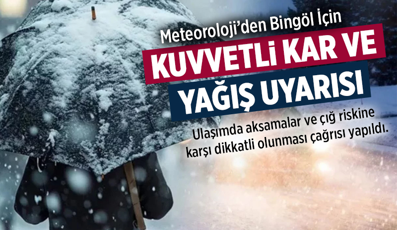 Meteoroloji 13. Bölge Müdürlüğü, akşam saatlerinden itibaren Bingöl'ün kuzey kesimlerinde kuvvetli karla karışık yağmur ve kar beklendiğini duyurdu. Yetkililer, ulaşımda aksamalar ve çığ riskine karşı dikkatli olunması çağrısı yaptı.