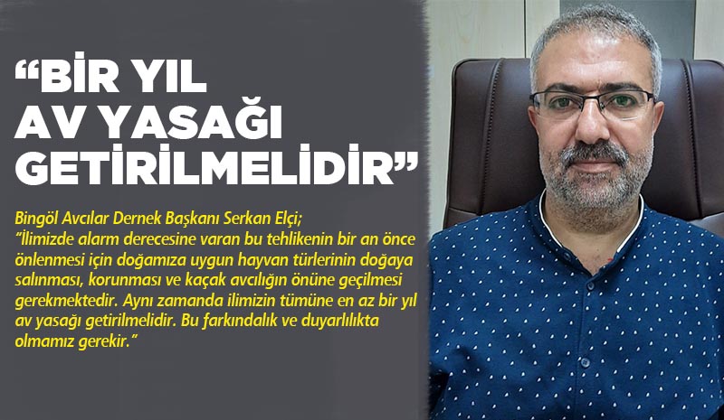 “Avcılar dernek başkanı Serkan Elçi: Bingöl ilimizde 04.03.2020 tarihinde yapılan il av komisyon toplantısında ilimiz genelinde yaban hayvan neslinin tükenme noktasına geldiği ve bu çerçevede tedbirlerin alınması gerekiyor. İlimizin tümünde en az bir yıl olmak üzere avlanmanın yasaklanmasını önerdik. Bu yasak sürecinde ilgili devlet bünyesindeki hayvan üretim çiftliklerinden yaban hayvanlarının doğaya salınımının yapılması gerektiğini ilettik. Bu işlemlerin saha çalışması ile hayvan türlerinin iklim koşulları ve bitki örtüsü gözetilerek yapılması gerektiğini söyledik. Maalesef önerimiz komisyonun sekreterliğini yapan Bingöl milli parklar şube müdürlüğü tarafından sebepsizce iptal edildi. Bizlerde avcı kuruluşları olarak kararlara şerh düşerek önerilerimizi Ankara (Merkez Av Komisyonuna) ilettik sonucunu beklemekteyiz.”