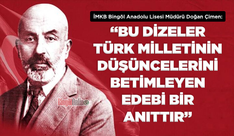 Saygı duruşu ve İstiklâl Marşı'nın ardından konuşan İMKB Bingöl Anadolu Lisesi Müdürü Doğan Çimen, “ Milletlerin hayatında geleceklerine yön veren önemli olaylar, kilometre taşı niteliğinde abidevi şahsiyetler vardır. Genç nesillerin iyi yetişmeleri, geleceğe güvenle bakabilmeleri, millet hayatında yeni değerlerin otaya çıkabilmesi ve milli şuurun ayakta tutulabilmesi için bu günleri ve şahsiyetleri hatırlamak gerekir. Ne mutlu bizlere ki İstiklal Marşı'mızın Türkiye Büyük Millet Meclisi tarafından “milli marş” olarak kabul edilişinin 99. yıldönümünü kutlamak ve bağımsızlığımızın simgesi olan “İstiklal Marşı”mızın şairi, Cumhuriyet dönemi fikir ve sanat öncülerinden Mehmet Akif Ersoy gibi büyük bir şahsiyeti yâd ediyor ve onun yüksek ideallerini davasını aşkını paylaşıyoruz. Büyük şair Mehmet Akif Ersoy tarafından yazılan İstiklal Marşı, dünyadaki en haklı, en kutsal savaşlardan birini, sömürgeciliğe karşı verilmiş ilk kurtuluş savaşını, millî haykırışı, direnişi, heyecanı anlatan eşsiz bir yapıttır. Mehmet Akif, güçlü anlatımıyla seçkin bir eser oluşturmuş, özlü dizeleriyle milletimizin, ülkesine yönelen tehditlere kararlılıkla direneceğini; bağımsızlığını koşullar ne olursa olsun koruyacağını dünyaya duyurmuştur. İmkânsızlıklar içindeki halkımıza o çetin koşullarda umut, güven, inanç aşılayan bu dizeler, aynı zamanda Türk Milletinin tarihinden getirdiği yüce kişilik özelliklerini, yüksek ruhunu, saygın ve soylu duygularını, düşüncelerini betimleyen edebi bir anıttır” dedi.