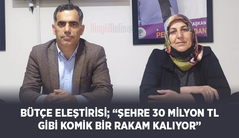 Bingöl Belediye Meclisinde görüşülen bütçe görüşmeleri son buldu. Bütçe görüşmelerinin tamamlanmasının ardın HDP grubundan bütçe eleştirisi geldi. HDP Belediye Meclis Grubu Sözcüleri Ferhat Yıldırım ve Hatice Kıtay, yaptıkları ortak açıklamada, “150 bin nüfuslu bir şehrin tüm harcamalarına 30 milyon TL gibi komik bir rakam kalıyor” diyerek tepki gösterdi.