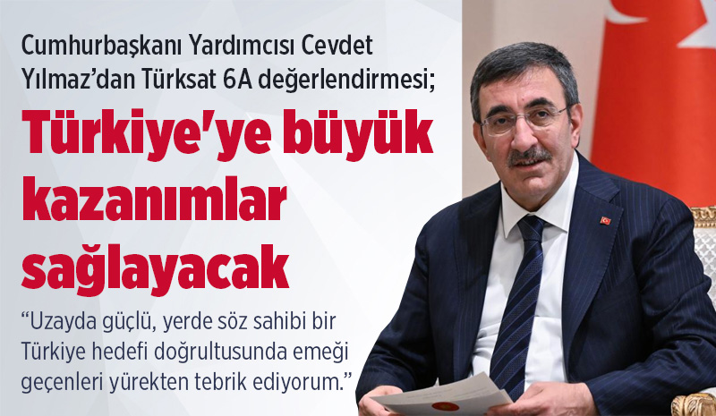 Cumhurbaşkanı Yardımcısı Cevdet Yılmaz, 'Yüksek veri iletim kapasitesi, geniş kapsama alanı ve gelişmiş teknolojik altyapısıyla Türksat 6A, sadece haberleşme alanında değil, savunmadan afet yönetimine, yayıncılıktan veri güvenliğine kadar pek çok stratejik alanda Türkiye'ye büyük kazanımlar sağlayacaktır' ifadesini kullandı.