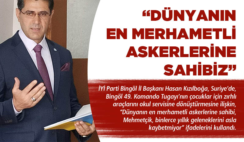 Askerlere gurur verici uygulamalarından dolayı teşekkür eden Başkan İYİ Parti Bingöl İl Başkanı Hasan Kızılboğa; “Bugün bir kere daha gördük ki Dünya'nın en merhametli askerlerine sahibiz. Bununla gurur duymalıyız. Bingöl 49. Komando Tugayı'na bağlı askerlerimiz bölgedeki çocuklara kendi zırhlı araçlarıyla okul servisi hizmeti veriyor. Dünya'nın hiçbir noktasında, hiçbir ordunun böyle bir şey yaptığını göremezsiniz. Mehmetçiğimiz binlerce yıllık geleneğini kaybetmeden, ülkesini savaş sahasının yanında, insani sahada da en güzel şekilde temsil ediyor ve yükseltiyor. Uğradığı onca zorluğa ve ihanete rağmen bağlarından asla kopmuyor. Şanlı ordumuza ve 49. Komando Tugayı'mıza bize böyle bir gururu yaşattıkları için en içten duygularımla teşekkür ediyorum. Allah yardımcınız olsun” dedi.