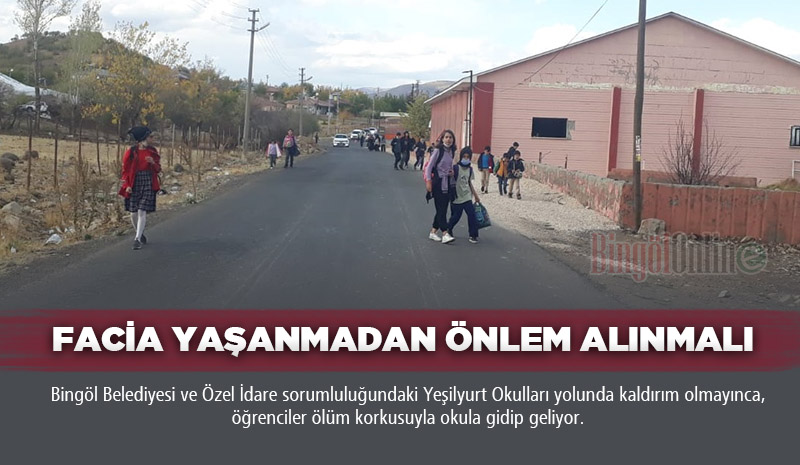 Bingöl merkez Yeşilyurt ilk ve Ortaokulu ile Yeşilyurt Anadolu Lisesinden Yaşamkent Sitesine kadar olan yolda kaldırım olmaması sebebiyle karayolundan yürüyerek okullarına ulaşmaya çalışan öğrenciler her gün ölümle burun buruna geliyor. Hiçbir önlemin alınmadığı yolda büyük bir facianın yaşanmasından korkuluyor.