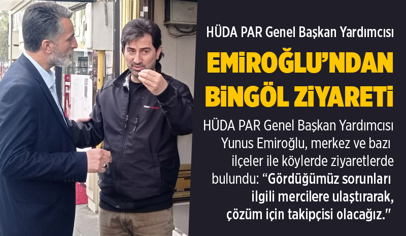 Emiroğlu'ndan Esnaf ziyaretiBingöl merkezdeki ziyaretleri kapsamında Emiroğlu, Bingöl İl Başkanı Refik Alpaya ve beraberindeki partili heyet, Bingöl merkez Dörtyol bölgesinde esnaf ziyaretlerinde bulundu. Ziyaret kapsamında esnafla birebir görüşmeler gerçekleştiren HÜDA PAR heyeti, vatandaşların talep ve sorunlarını dinleyerek not aldı. Esnafın karşılaştığı ekonomik zorluklar ve yerel sorunlar üzerine değerlendirmelerde bulunan heyet, çözüm önerilerini paylaştı. Ziyaret sonrası kısa bir açıklama yapan Genel Başkan Yardımcısı Yunus Emiroğlu, "Parti olarak halkımızla iç içe olmaya, onların sorunlarını yerinde dinlemeye büyük önem veriyoruz. Bingöl'de esnafımızın misafirperverliği ve samimi ilgisi bizleri memnun etti. Gördüğümüz sorunları ilgili mercilere ulaştırarak, çözüm için takipçisi olacağız." İfadelerini kullandı. Daha sonra Emiroğlu, İl Kadın kolları Başkanlığının düzenlediği seminere katıldı, parti çalışmaları ve gündeme dair açıklamalarda bulundu. Son olarak Emiroğlu, il yönetimi ve merkez ilçe teşkilatlarıyla kahvaltılı toplantıda bir araya geldi. Burada yapılan kahvaltının ardından teşkilat içi, gündeme dair ve parti çalışmaları hakkında açıklamalarda bulundu. HÜDA PAR Genel Başkan Yardımcısı Yunus Emiroğlu, 6 günlük ilimiz, ilçeleri ve köy ziyaretlerinin ardından Ankara'ya döndü.