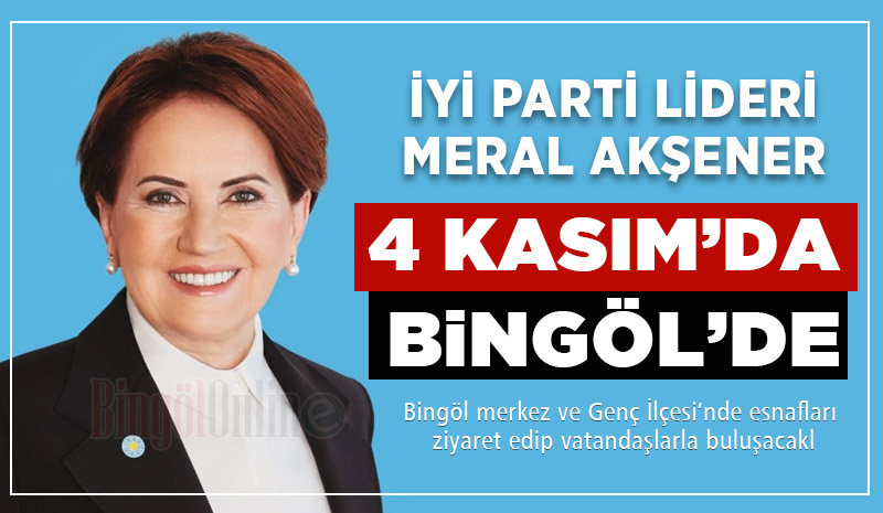 Esnaf ziyaretleri kapsamında il il dolaşan İyi Parti Lideri Meral Akşener'in yeni durağı Bingöl olacak. 4 Kasım 2021 Perşembe günü saat 11.00'te Bingöl Havalimanında karşılanacak olan Akşener, Bingöl merkezde esnaf ziyaretleri yapacak, vatandaşların sıkıntılarını dinleyecek. Saat 13.20'de Genç İlçesi'nde esnaf ziyaretini yapıp vatandaşlarla buluşacak olan Akşener, daha sonra Elazığ'ın Kovancılar İlçesi'ne gidecek.