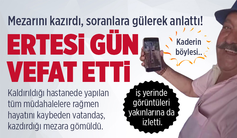 Olay, geçtiğimiz gün meydana geldi. 3 gün önce İstanbul'dan yakınlarını ziyaret etmek üzere Bingöl'ün Solhan ilçesine gelen Muzaffer Diken, aile kabristanına giderek kendisi için mezar kazdırdı. Mezar kazdırırken o anları cep telefonu ile kaydeden Diken, arkadaşı olan Hidayet Döner'in iş yerinde görüntüleri yakınlarına da izletti. Muzaffer Diken, bir gün sonra fenalaşarak Bingöl Devlet Hastanesi'ne kaldırıldı. Talihsiz adam burada yapılan tüm müdahalelere rağmen hayatını kaybetti. Diken'in cansız bedeni, kendisi tarafından kazdırılan mezarlığa defnedildi.