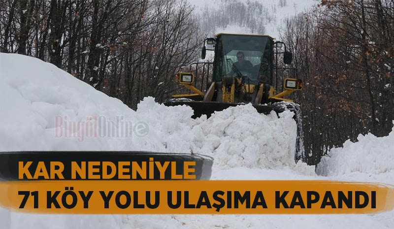 Meteoroloji Genel Müdürlüğü'nün uyarısının ardından Bingöl'de kar yağışı etkili olmaya başladı. Kar yağışının yer yer 1 metreyi aştığı kentte, 71 köy yolu da ulaşıma kapandı. İl Özel İdaresi Yol ve Ulaşım Hizmetleri Müdürlüğü'ne bağlı 11 ekip, 3 kamyon, 13 loder, 10 kepçe, 5 dozer, 19 greyder ve 2 kar savurma ile kapalı olan köy yollarında çalışmalarını sürdürüyor.