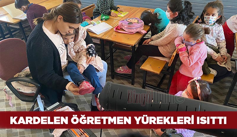 Karlıova ilçesine 12 kilometre mesafede bulunan Yeniköy İlkokulunda görevli Kardelen Sultan Tosun, soğuktan üşüyen öğrencisini kucağına alarak soba başında ısınmasını sağladı.