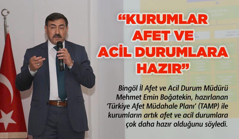 TAMP, Türkiye Afet Müdahale Planı toplantısı, Bingöl İl Afet ve Acil Durum Müdürü Mehmet Emin Boğatekin başkanlığında yapıldı. Toplantıda, Ana ve destek çözüm ortağı kurumların afet öncesi, esnası ve sonrasında yürütmeleri gereken faaliyetlerin hatırlanması, gibi ana başlıklar ile bilgi paylaşımında bulunuldu.