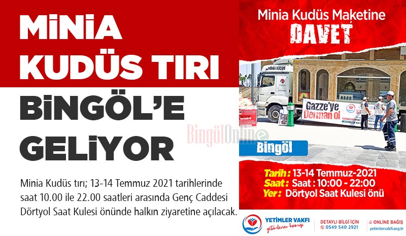 Minia Kudüs tırı; 13-14 Temmuz 2021 tarihlerinde saat 10.00 ile 22.00 saatleri arasında Genç Caddesi Dörtyol Saat Kulesi önünde halkın ziyaretine açılacak.
