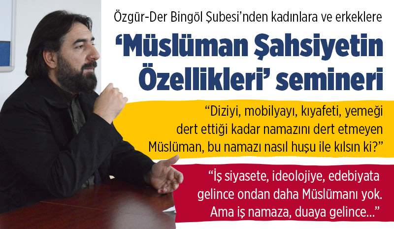 Müslüman şahsiyet nasıl olmalı?Kadınlara seslenişinde 'Diziyi, mobilyayı, kıyafeti, yemeği dert ettiği kadar namazını dert etmeyen Müslüman, bu namazı nasıl huşu ile kılsın ki?' diyen Kıranşal, erkeklere hitabında da 'İş siyasete, ideolojiye, edebiyata gelince ondan daha Müslümanı yok. Ama iş namaza gelince huşu yok, duaya gelince samimiyet yok, haramlara gelince takva yok, yaşantıya gelince örneklik yok, davaya gelince kardeşlik yok, infaka gelince fedakârlık yok' dedi.![]() Özgür-Der Bingöl Şubesinin gerçekleştirdiği 2024-25 dönemi aylık seminerler dizisinin üçüncüsünde, Araştırmacı Yazar Dr. Abdulaziz Kıranşal'ın aynı gün içinde önce kadınlara, ardından erkeklere “Müslüman Şahsiyetin Özellikleri” konu başlıklı semineri gerçekleştirildi. Erhan Ozan'ın her iki programında açılış konuşmasını ve sunumunu yapmasıyla başlayan seminerler daha sonra Abdulaziz Kıranşal'ın sunumuyla devam etti. Özgür-Der Bingöl Şubesi Konferans Salonunda başlayan seminer programında Abdulaziz Kıranşal, önce kadınlara akşamında ise erkeklere ayrı seminer verdi. Kadınlara seslendi: “Diziyi, mobilyayı, kıyafeti, yemeği dert ettiği kadar namazını dert etmeyen Müslüman, bu namazı nasıl huşu ile kılsın ki?”Abdulaziz Kıranşal hanımlara verdiği seminerde sözlerine “dertsizlik, umursamazlık, vurdumduymazlık bir Müslümanın başına gelebilecek en büyük musibetlerden birisidir” diyerek giriş yaptı: “Günahlarını, kul haklarını, ahiretini dert etmeyen bir Müslüman salih amel işleyemez. İbadetlerini dert etmeyen Müslüman namazını huşu ile kılamaz. Ailesini dert etmeyen Müslüman çocuklarını yetiştiremez. Ümmeti dert etmeyen Müslüman harekete geçemez. Dertsiz Müslüman dua bile edemez. Dertsiz Müslüman tövbe edemez. İbadetlerini dert etmeyen Müslüman namazını huşu ile kılamaz. Bir diziyi dert ettiği kadar, bir mobilyayı, bir kıyafeti, bir yemeği dert ettiği kadar namazını dert etmeyen Müslüman, bu namazı nasıl huşu ile kılsın ki?”