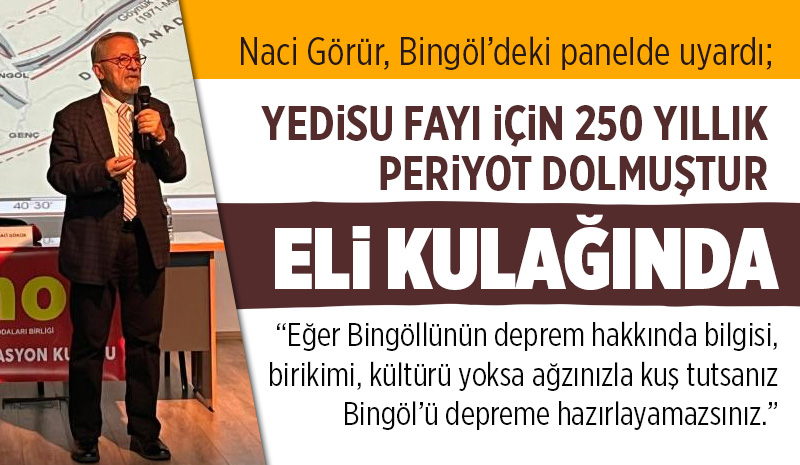 Bingöl'de panele katılan deprem bilimci Prof. Dr. Naci Görür, Yedisu fayı için 250 yıllık periyodun dolduğuna dikkat çekti ve 'Eli kulağında' dedi. Görür, depreme dirençli kent vurgusunda da bulunarak uyardı: 'Eğer Bingöllünün deprem hakkında bilgisi, birikimi, kültürü yoksa ağzınızla kuş tutsanız Bingöl'ü depreme hazırlayamazsınız.'