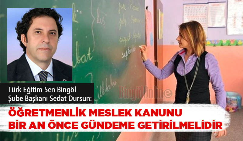23 Ekim 2018'de Cumhurbaşkanlığı Külliyesi'nde düzenlenen 2023 Eğitim Vizyonu Tanıtım Toplantısı'nda Öğretmenlik Meslek Kanunu'nun çıkarılacağı bilgisinin verildiğini hatırlatan Türk Eğitim Sen Bingöl Şube Başkanı Sedat Dursun, 2 yıldır herhangi bir adım atılmadığını söyledi.
