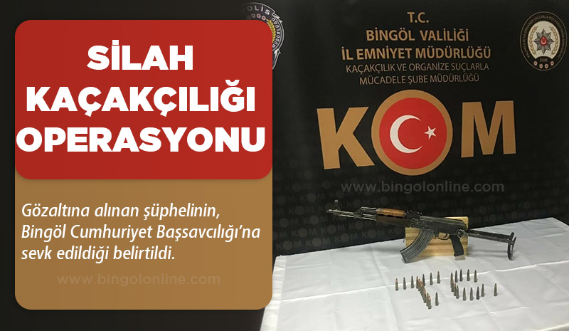 Bingöl İl Emniyet Müdürlüğü Kaçakçılık ve Organize Suçlarla Mücadele Şube Müdürlüğü görevlilerince silah kaçakçılığı yapan şahıslar hakkında yürütülen çalışmalarda 03.02.2020 tarihinde gerçekleştirilen operasyonda S.T. isimli şüphelinin ikametinde yapılan aramada 1 adet AK-47 (Kalaşnikov) otomatik tüfek ve bu tüfeğe ait 30 adet 7.62 mm mermi ele geçirildiği bildirildi.