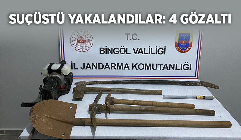 “Bingöl İl Jandarma Komutanlığınca emniyet ve asayiş ile kamu düzeninin korunmasına yönelik olarak Bingöl İli Solhan ilçesi kırsalında icra edilen önleyici kolluk faaliyeti esnasında; 04 Aralık 2021 tarihinde Solhan ilçesi kırsalında 4 şüpheli şahsın kaçak kazı yaptıkları tespit edilmiştir. Şüpheli şahısların suçta kullandıkları 1 adet hilti, 2 adet hilti ucu, 2 adet kürek, 2 adet kazma, 1 adet balyoz, 1 adet sökücü demiri ile birlikte suçüstü yakalanmıştır. Şüpheliler ile ilgili adli işlemler devam etmektedir” denildi.