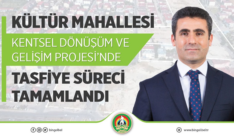 Bingöl Belediye Başkanı Erdal Arıkan, yaptığı açıklamada, Kültür Mahallesi'nde 15 hektar alan üzerinde uygulanan Kentsel Dönüşüm ve Gelişim Projesi'nde sözleşmeleri feshedilen yüklenici firmalara sözleşme iptallerinden kaynaklı haklarının ödenerek tasfiye sürecinin tamamlandığını müjdeledi.