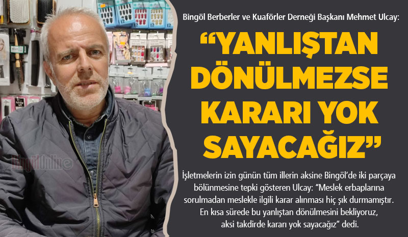 “Bizler haftada bir gün olan dinlenme ve istirahat gününü kendi özgür irademizle belirlemek istiyoruz” diyen Ulcay: “Yaklaşık 14 yıldır Bingöl Berberler ve Kuaförler Derneği'nin almış olduğu karar gereği meslektaşlarımız Pazar günlerini kendilerine istirahat günü olarak belirlemiştirler. Tabi arada istisnalar olduysa da Ticaret Bakanlığı'nın kararına uyarak Pazar günlerini kendi istirahat günümüz olarak belirlemiş bulunuyoruz. Şehrin ikiye bölünmesini değil tüm şehirde Pazar günü kapatma kararının uygulanmasını istiyoruz. Günün 10-12 saat zamanı ayakta icra eden meslektaşlarımızın haftada bir gün istirahat hakkı salt çoğunluğun onayı ile haftanın Pazar günü olacaktır. Günün dayatılması çok yanlış bir karar bundan en kısa sürede dönülmelidir” diyerek tepki gösterdi.