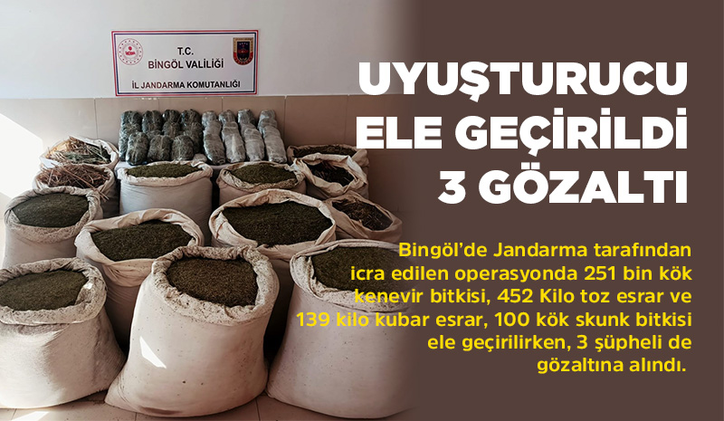 Valilikten yapılan açıklamada, “Bingöl İl Jandarma Komutanlığı unsurlarınca yürütülen istihbari ve teknik çalışmalar neticesinde; Bingöl İli Genç ilçesi kırsalında şüpheli şahıslar tarafından yüklü miktarda yasadışı kenevir ekimi yapıldığı ve kenevir tarlalarından esrar elde edilerek piyasaya sürüleceğine dair elde edilen bilgiler doğrultusunda; 30 Ağustos 2021 tarihinde Genç ilçesi kırsalında icra edilen operasyonda 3 farklı noktada toplam 251 bin 895 kök kenevir bitkisi, 452 kilo toz esrar, 139 kilo kubar esrar, 100 kök skunk bitkisi ele geçirilmiş, olayla ilgili 3 şüpheli gözaltına alınmıştır” denildi.