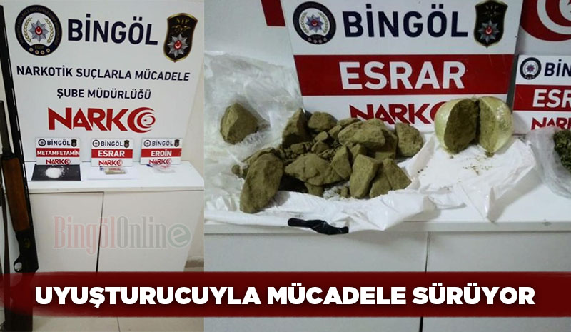 Valilik tarafından yapılan açıklamada, “Emniyet Müdürlüğümüz Narkotik Suçlarla Mücadele Şube Müdürlüğüne bağlı ekiplerimizce uyuşturucu madde ticareti yapmak ve uyuşturucu madde kullanmak suçlarına yönelik yapmış olduğumuz çalışmalar kapsamında düzenlenen operasyonda yapılan aramalarda 11,20 gr Metamfetamin, 1,90 gr toz esrar, 0,40 eroin maddesi ile 1 adet av tüfeği ele geçirilmiştir. Konuyla ilgili olarak şüpheli şahsa 'Uyuşturucu Madde Ticareti Yapmak' suçundan işlem yapılmış olup hazırlanan evraklar Bingöl Cumhuriyet Savcılığı'na gönderilmiştir. Yine, 06.01.2022 günü 'Uyuşturucu Madde Ticareti Yapmak ve Uyuşturucu Madde Kullanmak' suçlarına yönelik yapmış olduğumuz çalışmalar kapsamında düzenlenen operasyonda yapılan aramalarda 523 gram toz esrar ve 32 gram ot esrar ele geçirilmiştir” denildi.