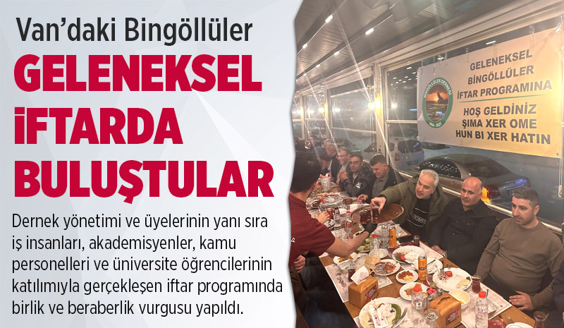 Van'da faaliyet gösteren Bingöl Eğitim Kültür ve Dayanışma Derneği'nce her yıl düzenlenen ‘İftar Buluşması' programı bu yıl da gerçekleştirildi. Dernek yönetimi ve üyelerinin yanı sıra iş insanları, akademisyenler, kamu personelleri ve üniversiteli öğrencilerin katılımıyla Van merkez İskele Caddesi'ndeki bir restaurantta düzenlenen iftar programında konuşan Dernek Başkanı Selim Elhansu, birlik ve beraberlik mesajları verdi.