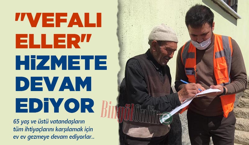 Ülke genelinde olduğu gibi Bingöl'de de korona virüs ile mücadele alınan tedbirler kapsamında sürüyor. Salgın nedeniyle evden çıkmaları kısıtlanan 65 yaş üstü ile kronik rahatsızlığı bulunan vatandaşların talepleri doğrultusunda ihtiyaçlarını ise Valilik Koordinesinde oluşturulan Vefa Sosyal Destek Grubu karşılamayı sürdürüyor. Kent merkezi, ilçe, köy ve bağlı mezralarında kadar çalışmalarını sürdüren vefalı eller, ilaç, alış veriş gibi hizmetlerin yanı sıra maaş ve sosyal destekleri de ulaştırarak önemli bir hizmeti yerine getiriyor.