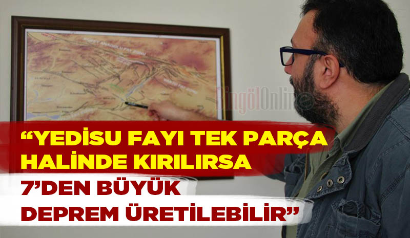 Geçmişte büyük depremlerin yaşandığı ve önemli fay kuşaklarının arasında yer alan Bingöl için kritik bir uyarı üniversitede görevli Enerji, Çevre ve Doğal Afet Araştırmaları Merkezi Müdürü Dr. Kenan Akbayram'dan geldi. Bingöl'ün Kuzey Anadolu, Doğu Anadolu ve Varto fay zonları arasında yer alan bir il olduğunu hatırlatan Dr. Akbayram, söz konusu fay kuşaklarında olası depremlerin beklendiğini söyledi. Yedisu fay zonunda yaklaşık 237 yıl önce bir deprem yaşandığını ve deprem tekrarlanma yılının 200-250 aralığında olduğunu altını çizen Dr. Akbayram, "Bilindiği üzere Bingöl 3 tane fay zonunun kesiştiği bir yer. Bunlar Doğu Anadolu fay zonu, Kuzey Anadolu fay zonu ve Varto fay zonu. Bilindiği üzere Kuzey Anadolu fay zonunun bazı kesimlerinde uzun yıllardır depremler olmadı fakat depremlerin olması gerekiyor. Bunlardan en önemlilerinden bir tanesi bizim Yedisu fayı veya Yedisu fay zonu adını verdiğimiz Bingöl ile Erzincan arasındaki yaklaşık 75 kilometrelik fay kuşağı. Bu fay kuşağının tek parçalı olarak kırılması halinde 7'den büyük deprem üretileceği hesaplandı. Bununla birlikte bu fay kuşağında en son deprem 1784 yılında oldu. Kuzey Anadolu fayının deprem tekrarlanma aralığının 200- 250 yıl olduğu düşünüldüğünde burada kısa süre içinde deprem olması çok olası. Maalesef Bingöl ve çevre illere hasar verebilecek bir deprem olacaktır" diye konuştu.